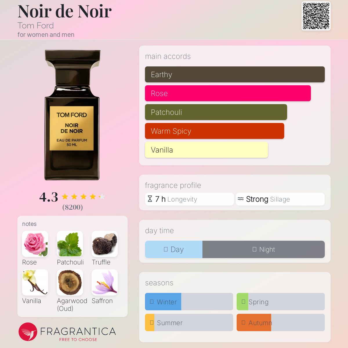 Noir de Noir by Tom Ford is a Chypre fragrance for women and men. Noir de Noir was launched in 2007. Noir de Noir was created by Jacques Cavallier Belletrud, Harry Fremont and Olivier Cresp. Top note is Saffron; middle notes are Black Rose, Truffle and Floral Notes; base notes are Patchouli, Vanilla, Agarwood (Oud) and Oakmoss.